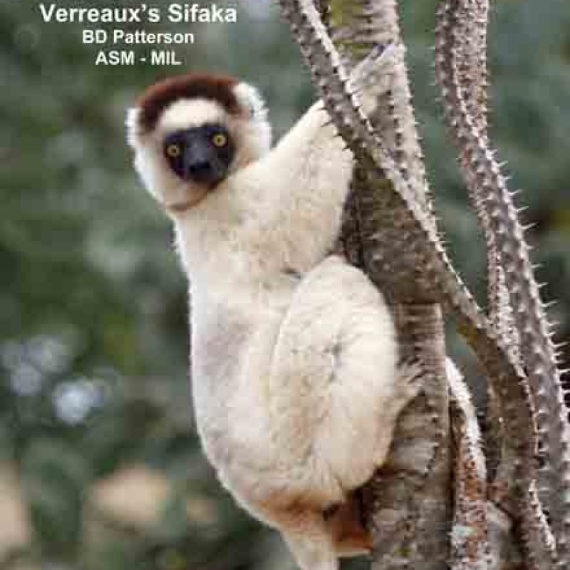 Side view of adult grasping trunk, facing camera. Also as White Sifaka.