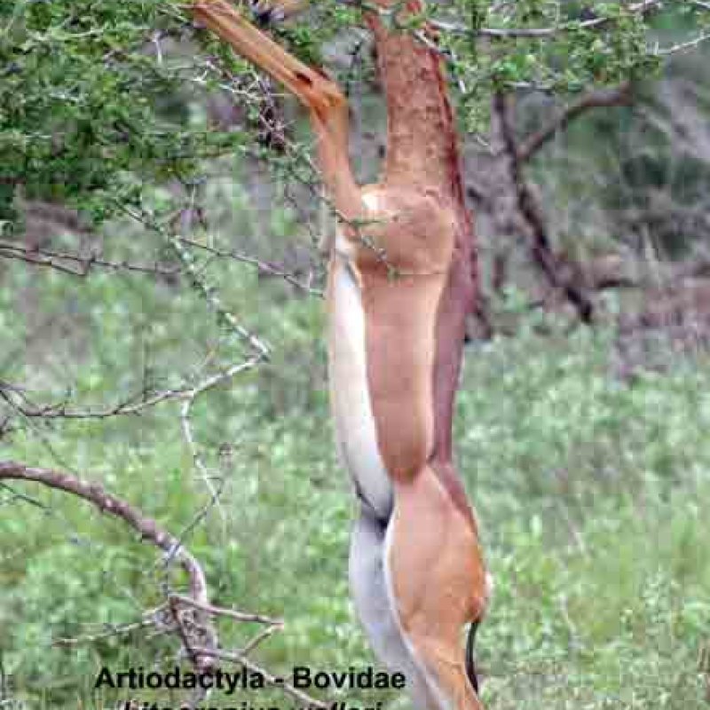 Adult male, side view, on hind limbs with head in tree. Litocranius walleri walleri. Also as Southern Gerenuk.