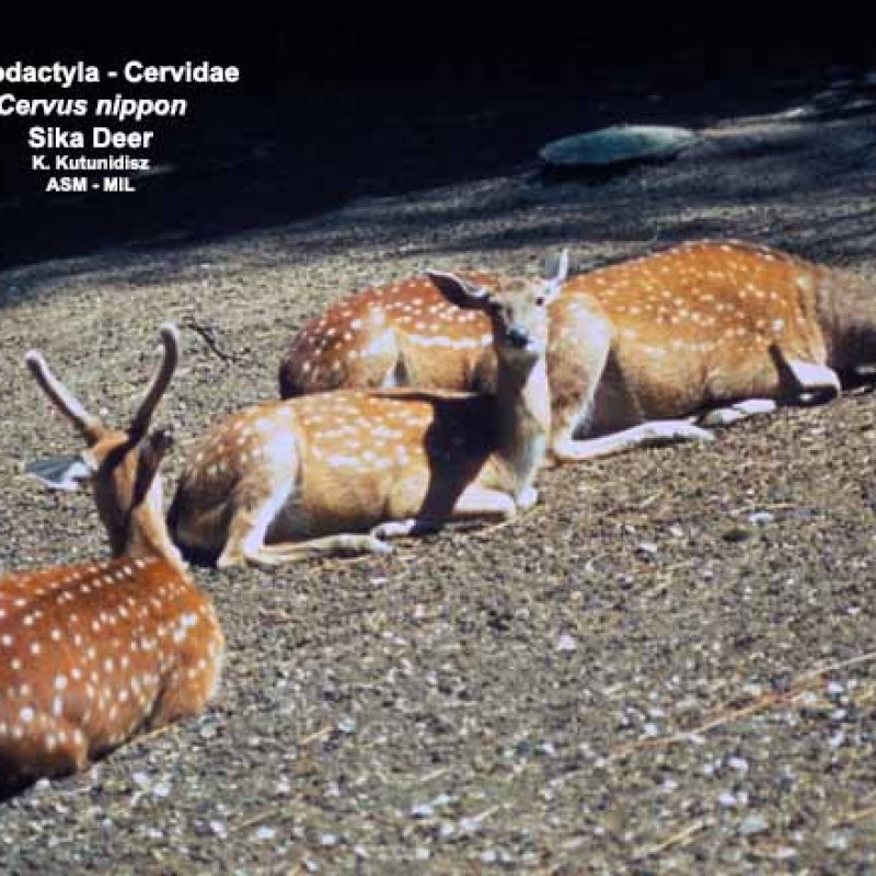 Two adult males in velvet, one female lying down. Cervus nippon pseudaxis. Also as Cervus pseudaxis, Vietnamese Sika Deer.
