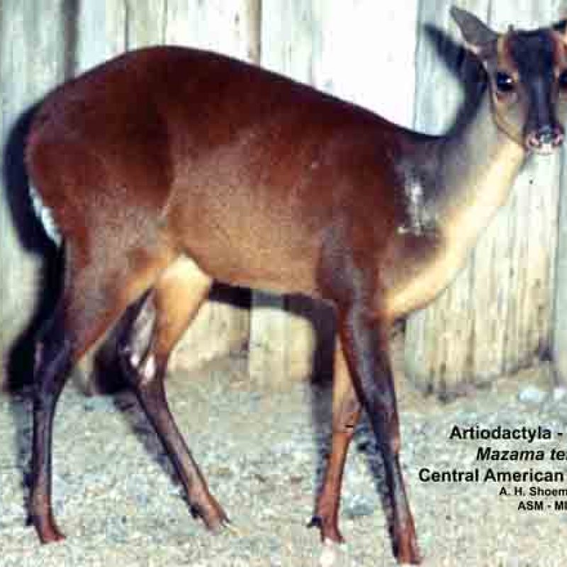 Oblique view of adult female. Formerly Mazama americana temama. Also as Mexican Red Brocket.