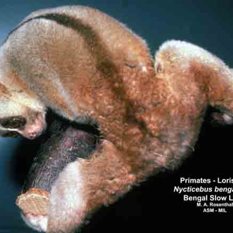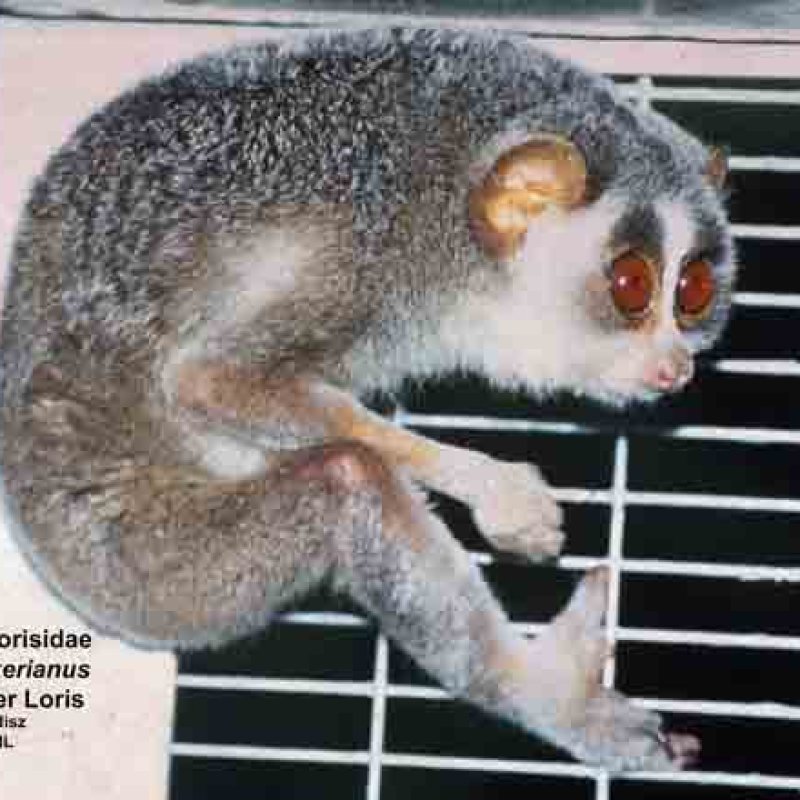 Dorso-lateral view. Also as Ashy Slow Loris|Northern Slow Loris.