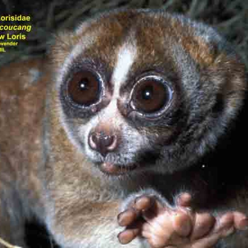 Close-up view of face and hand. Also as Greater Slow Loris|Sumatran Slow Loris|Malaysian Slow Loris.