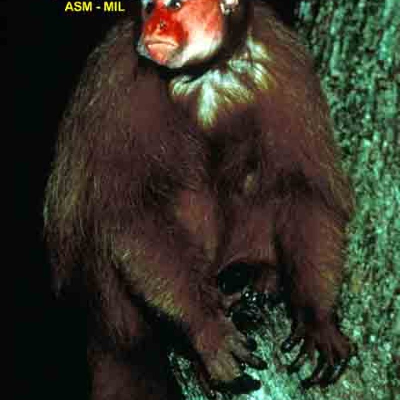 Front view of adult female. Cacajao calvus rubicundus. Also as Bald Uakari.