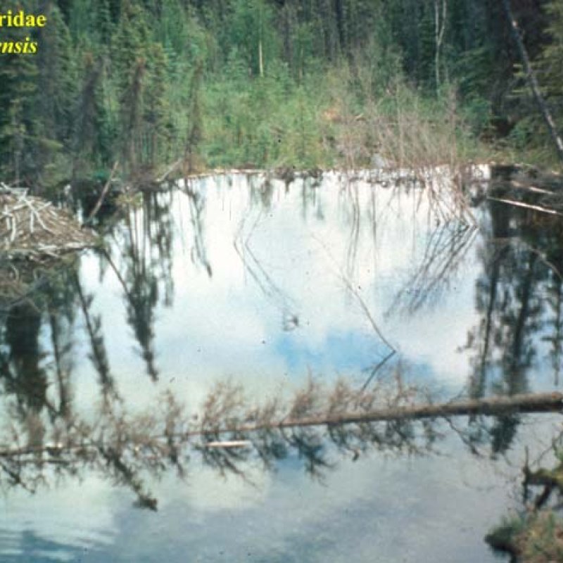 View of beaver pond, lodge, and dam