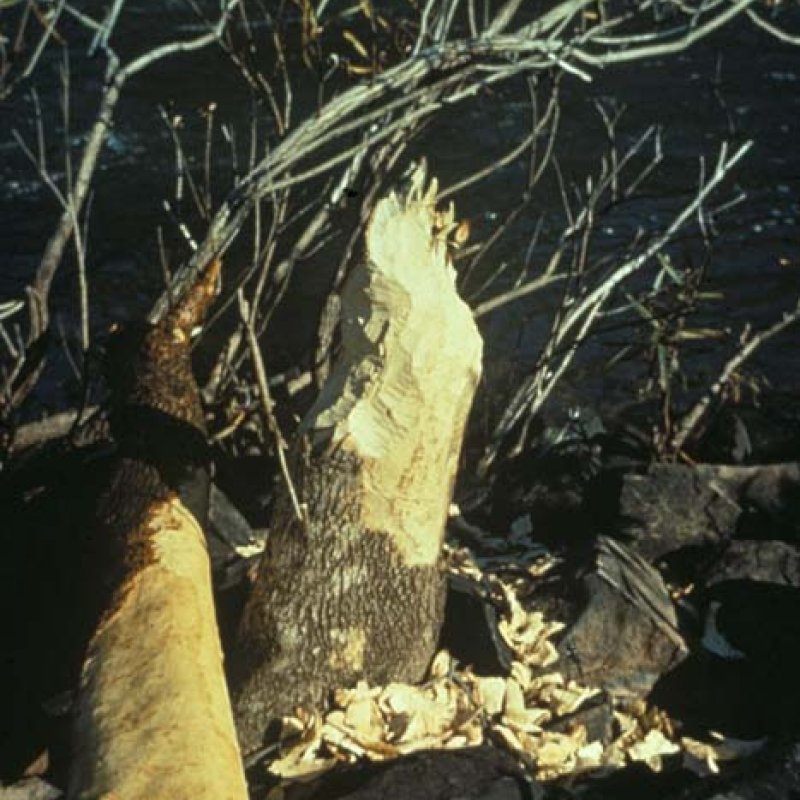 Tree stump and trunk showing gnawing by beaver