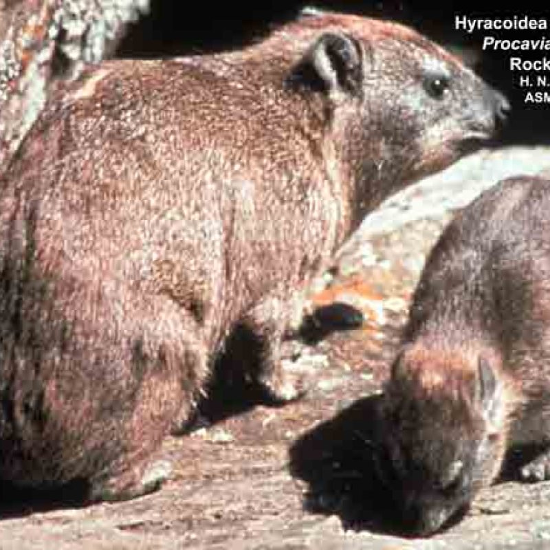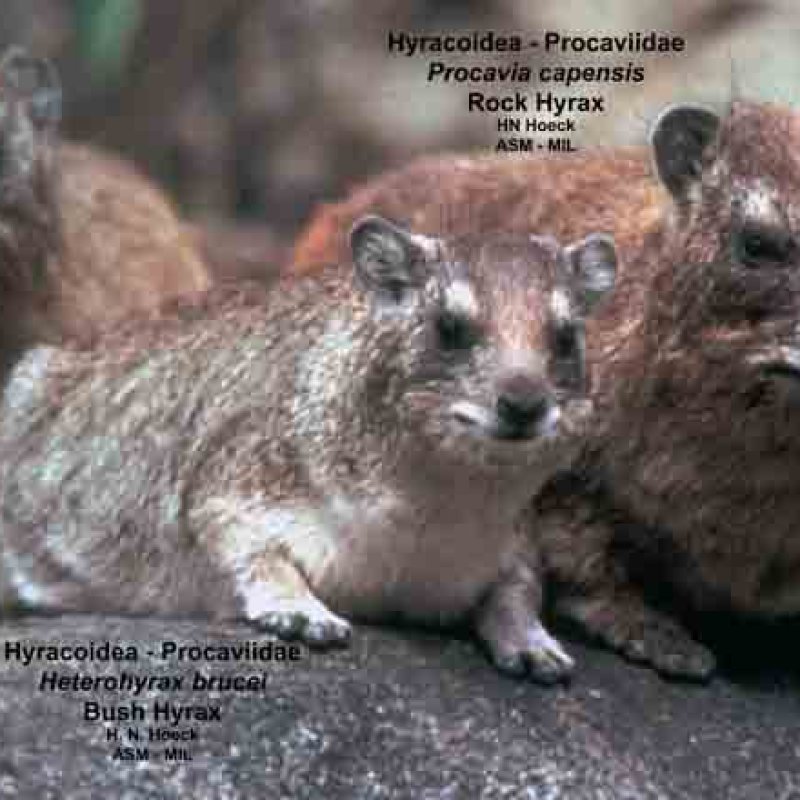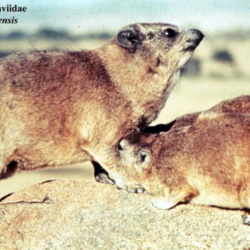Rock Hyrax, Procavia capensis (brown coat) with Heterohyrax brucei dieseneri. Also as Yellow-spotted Rock Hyrax.
