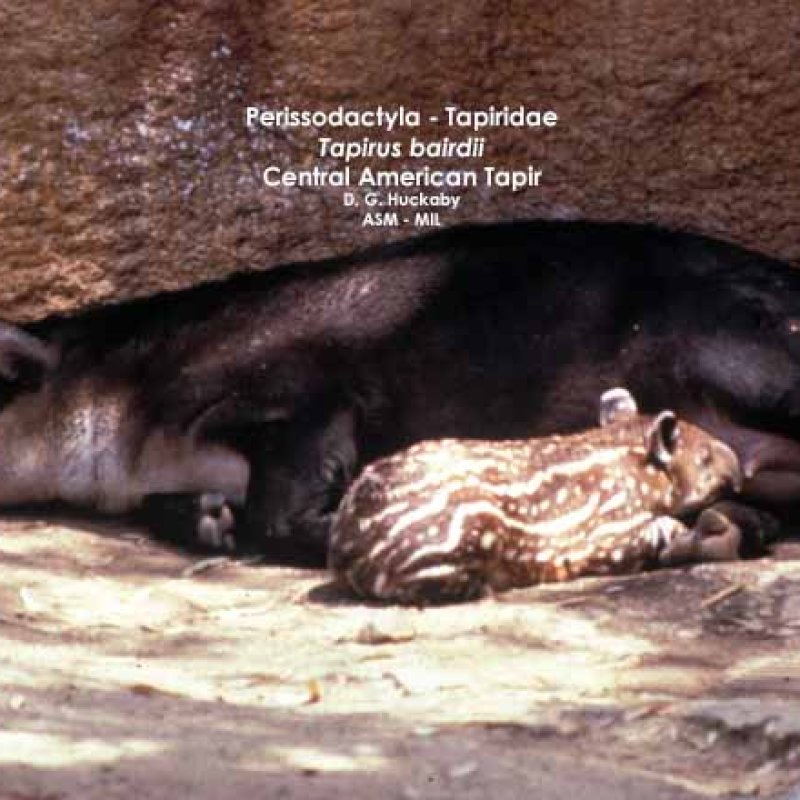 Female nursing young, lying on ground; also as Tapirella bairdii. Also as Baird's Tapir.
