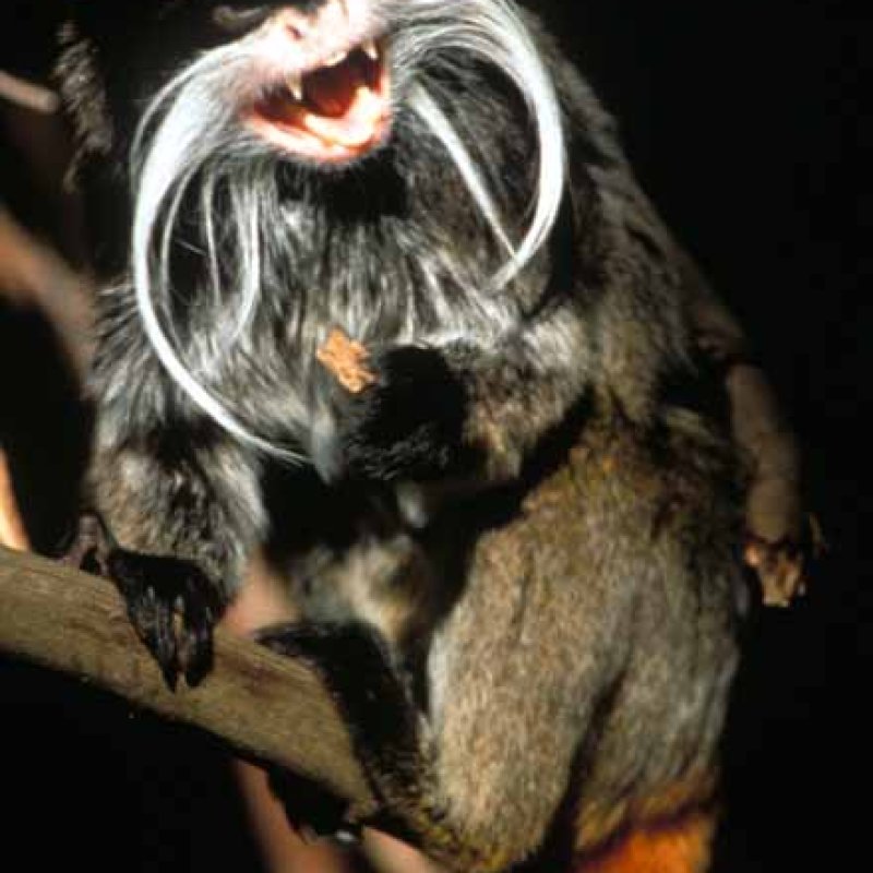 Front view of individual with mouth open, in apparent threat, showing canines, Saguinus imperator subgrisescens. Also as Bearded Emperor Tamarin|Black-chinned Emperor Tamarin. Formerly Cebidae (Callitrichinae).