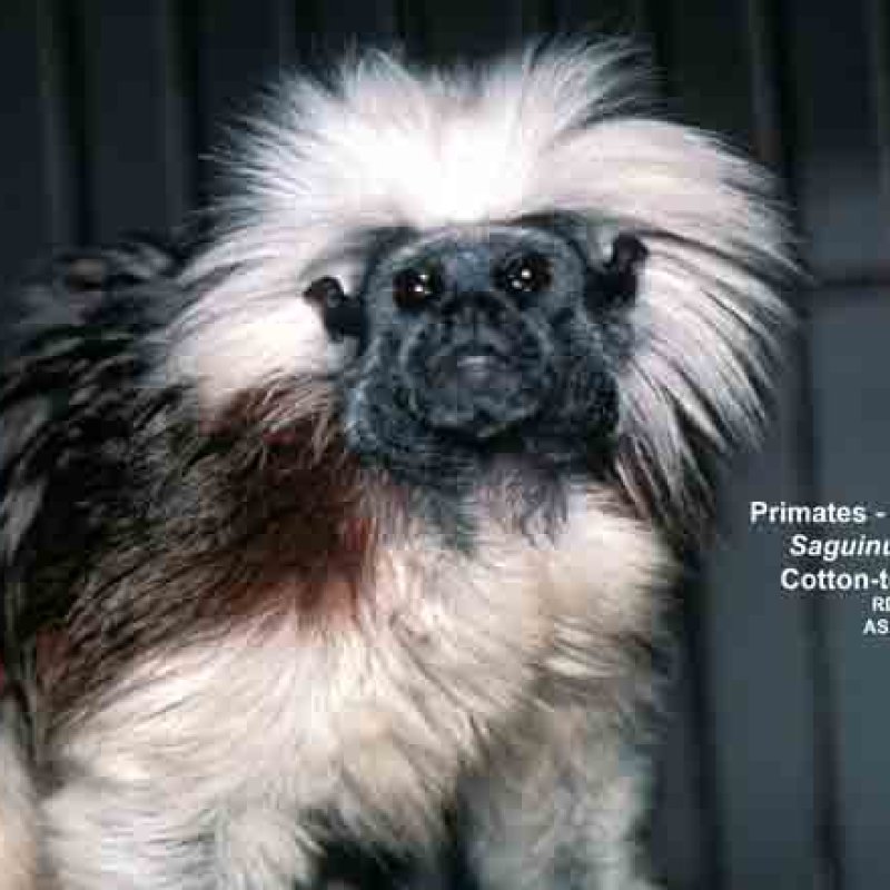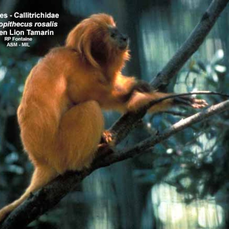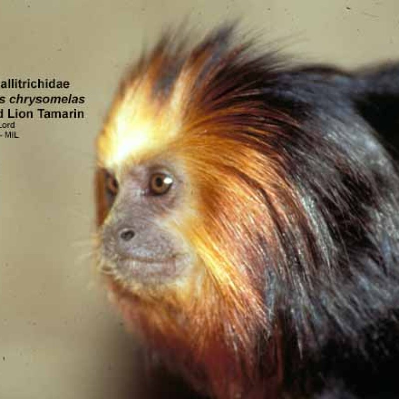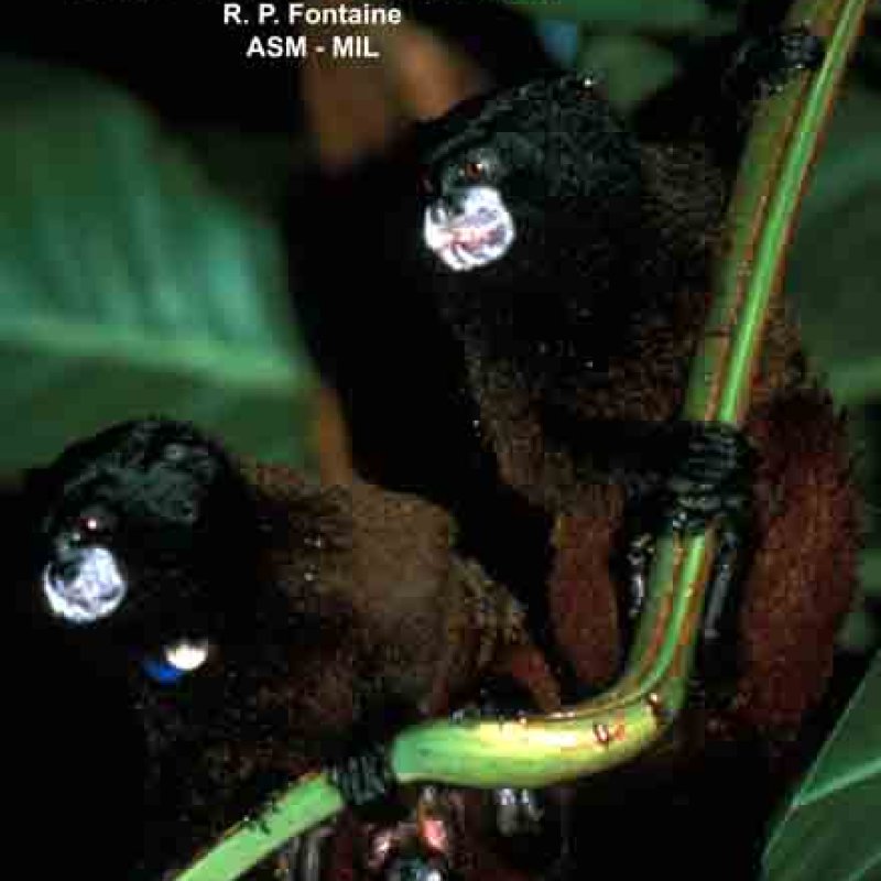 Front view of adult male and female clinging to branch, showing feet. One has neck tags. Formerly Leontocebus fuscicollis. Also as Brown-mantled Tamarin|Hershkovitz's Saddle-back Tamarin|Saddleback Tamarin|Acre Saddle-back Tamarin|Ávila-Pires's Saddle-back Tamarin|Gray-fronted Saddle-back Tamarin|Lako's Saddle-back Tamarin. Formerly Cebidae (Callitrichinae).