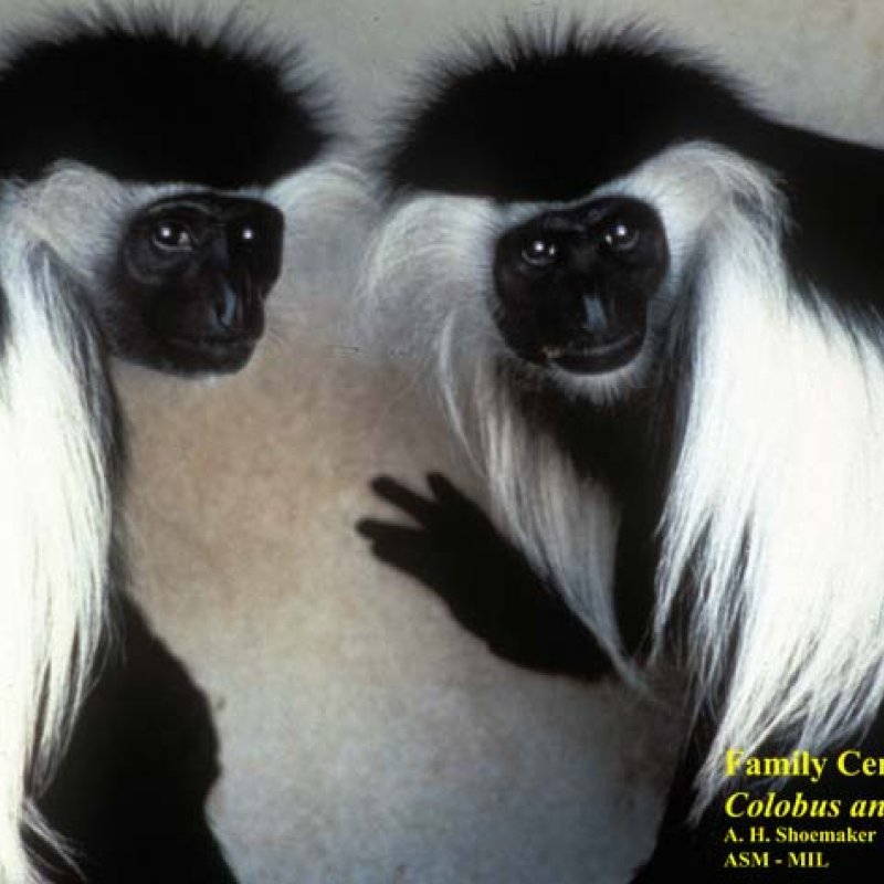 Side view, close-up of two individuals. Colobus angolensis palliatus, Peter's Angolan Colobus. Also as Angola Colobus|Angolan Black-and-white Colobus.