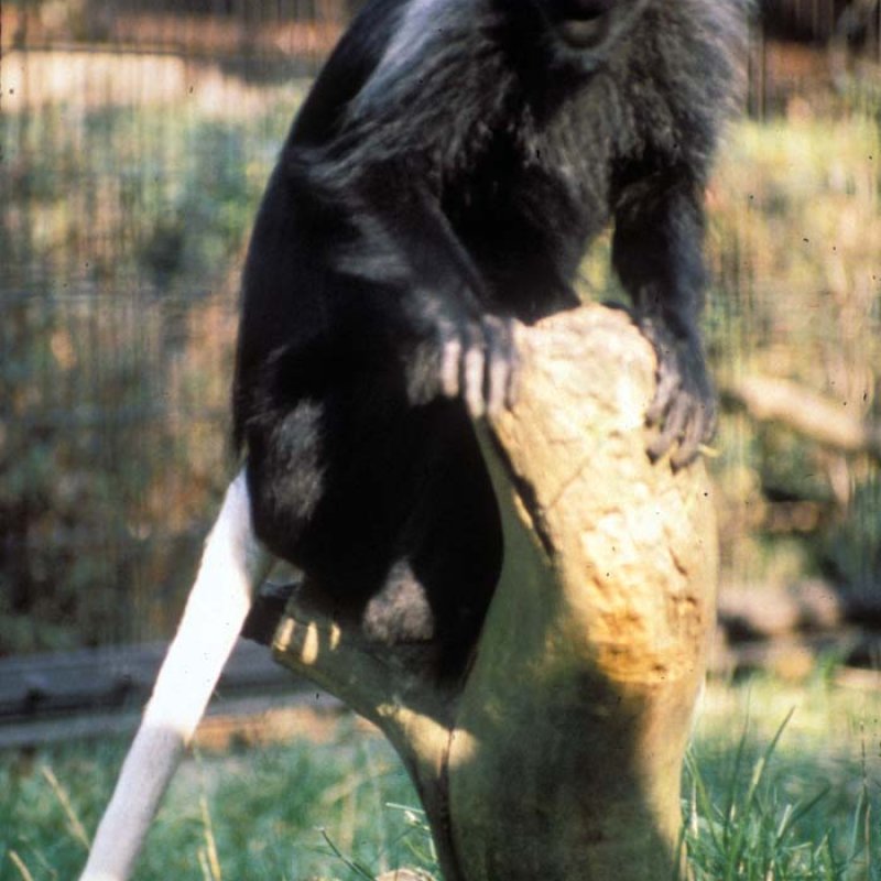 Frontal view. Also as Ursine Black-and-white Colobus|Western Black-and-white Colobus|Western Pied Colobus.