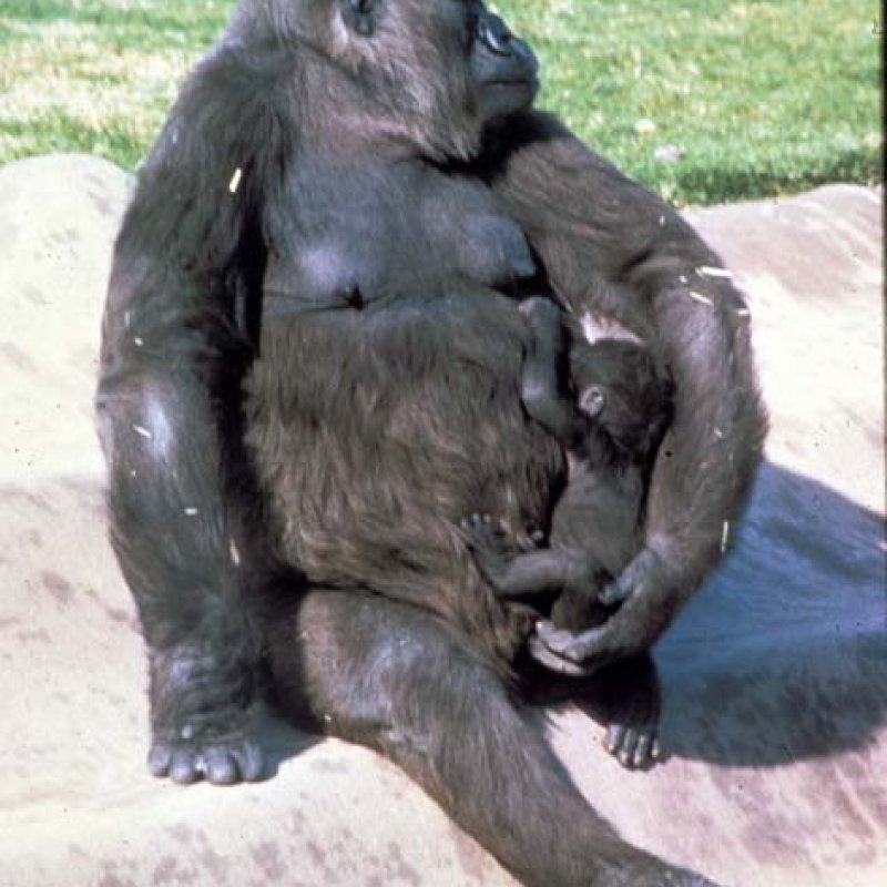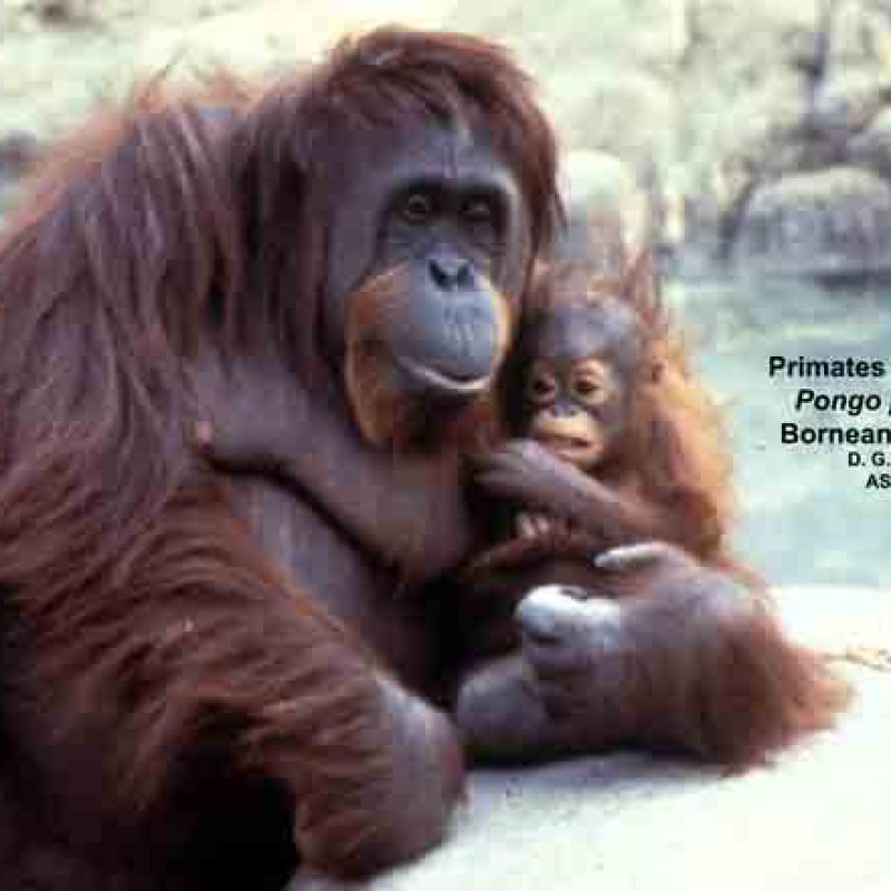 Adult female carrying infant, walking bipedally and "pant-hooting". Also as Common Chimpanzee.