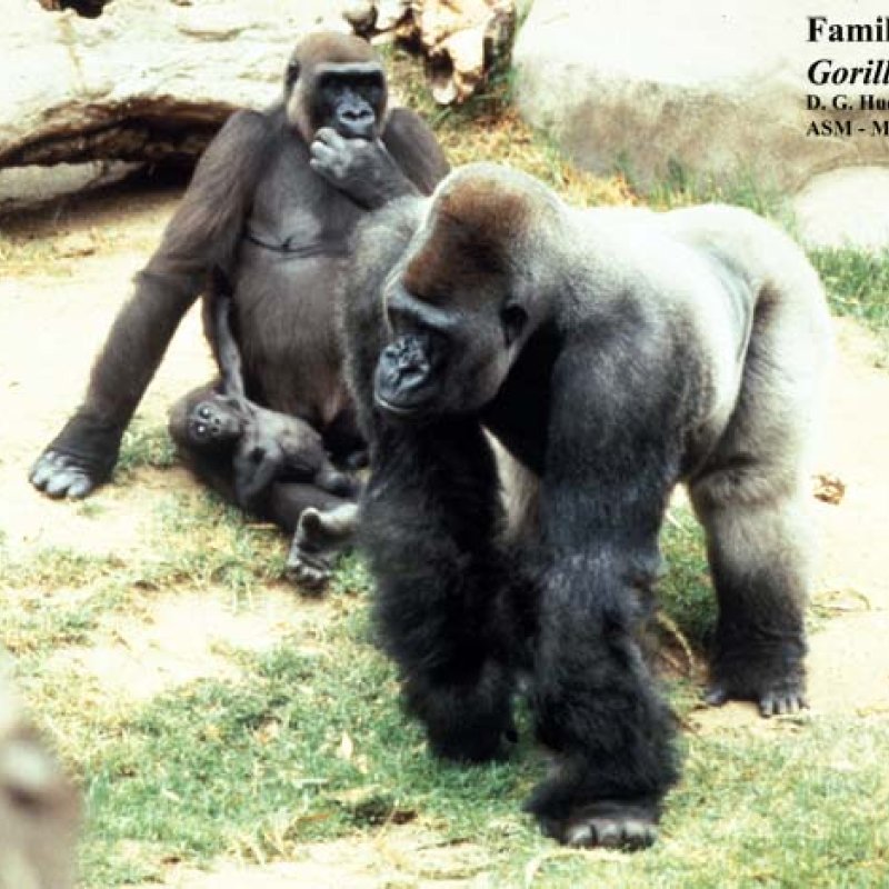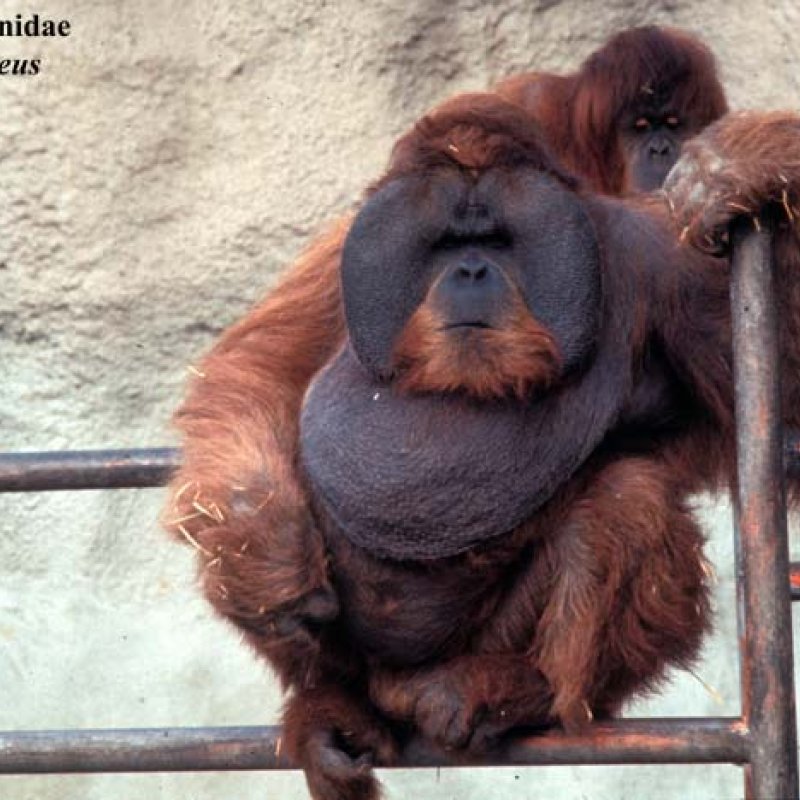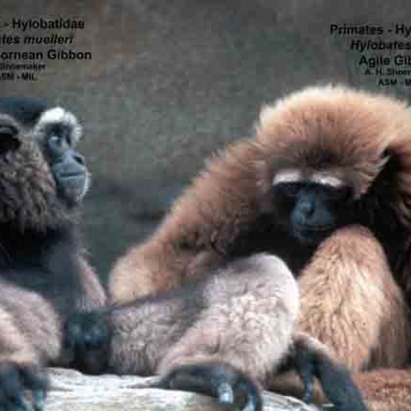 Adult female (brown coat), subadult male Hylobates muelleri, Southern Gray Gibbon (gray coat). Also as Dark-handed Gibbon.