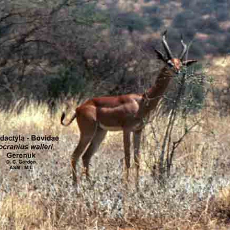 Side view of male. Litocranius walleri walleri. Also as Southern Gerenuk.