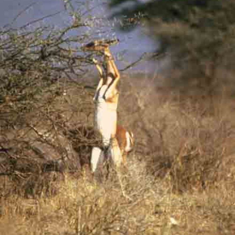 Standing on hind legs in typical feeding posture. Litocranius walleri walleri. Also as Southern Gerenuk.