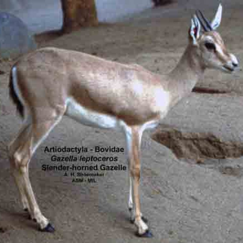 Side view, standing, female. Gazella leptoceros leptoceros.