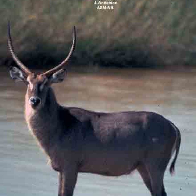 Side view of male. Kobus ellipsiprymnus ellipsiprymnus. Also as Kobus ellipsiprymnus, Ellipsen Waterbuck.