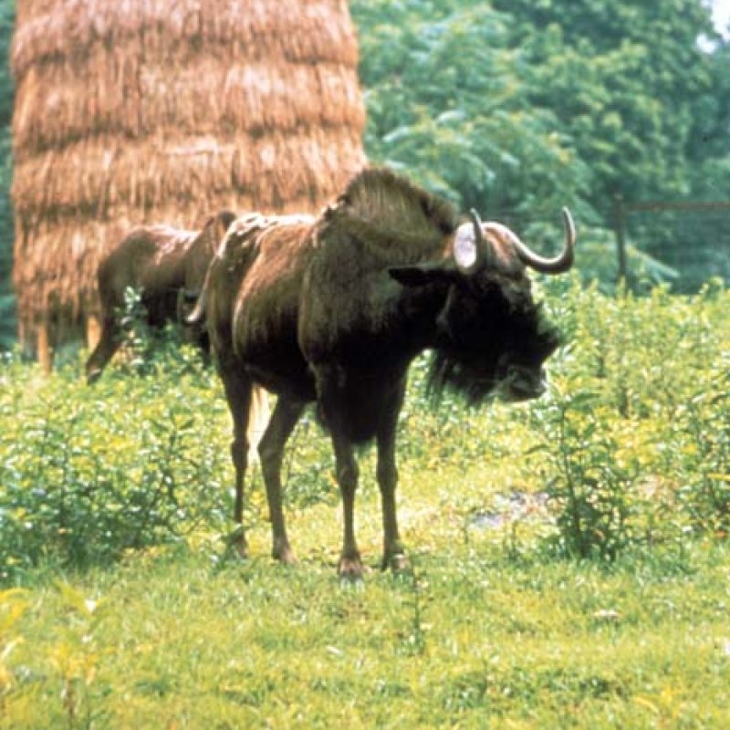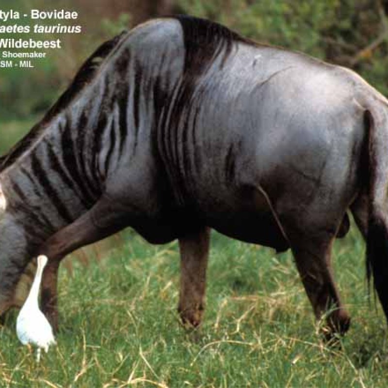 Side view, feeding. Connochaetes taurinus albojubatus. Also as Connochaetes albojubatus, Eastern White-bearded Wildebeest. Also as Brindled Gnu|Gnu.