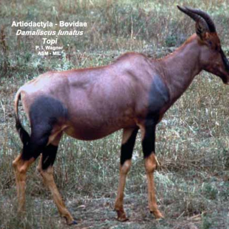 Damaliscus lunatus topi. Small herd. Formerly as Damaliscus korrigum topi. Also as Damaliscus topi, Coastal Topi.