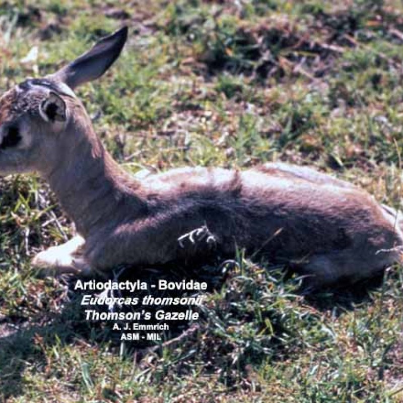 Newborn resting on ground. Eudorcas thomsonii nasalis. Also as Eudorcas nasalis, Serengeti Thomson's Gazelle.