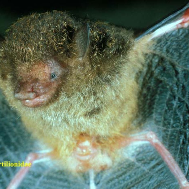 Close-up of head, oblique view. Also as Common or Schreiber's Bent-winged Bat. Formerly in Vespertilionidae.