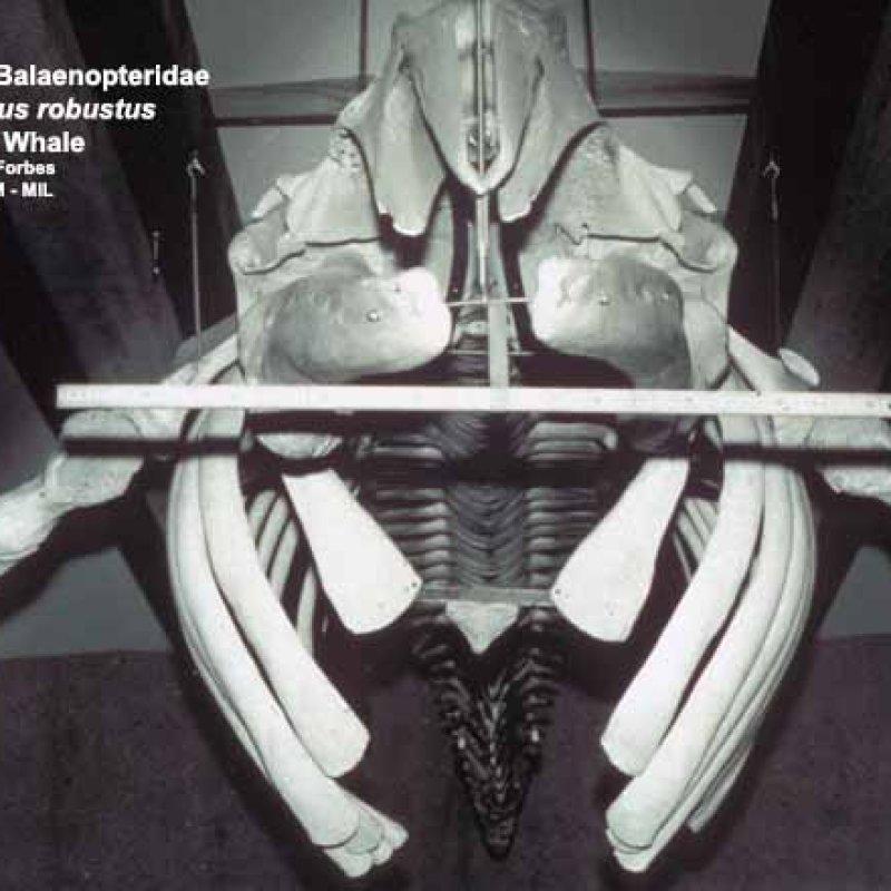 Anterior view of mounted skeleton [bar represents 1 meter]. Formerly in order Cetacea. Formerly in Eschrichtiidae.