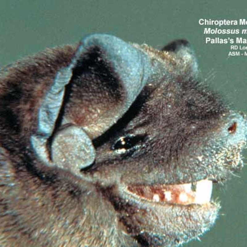 Close-up of head, oblique view. Formerly part of Molossus sinaloae.