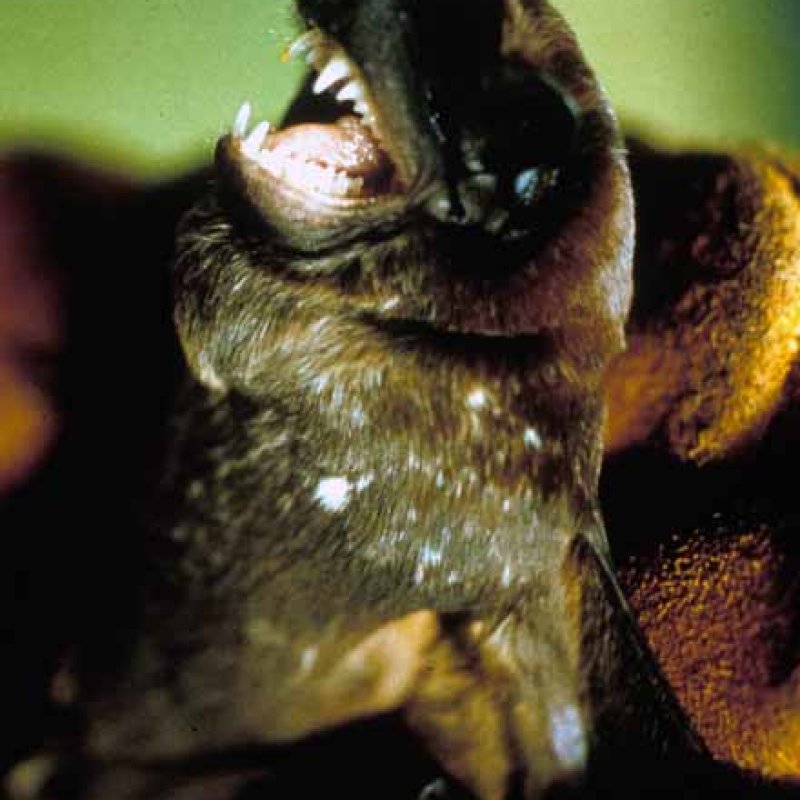 Close-up view with mouth open, teeth exposed. Also as Black Free-tailed Bat|Black Mastiff Bat.