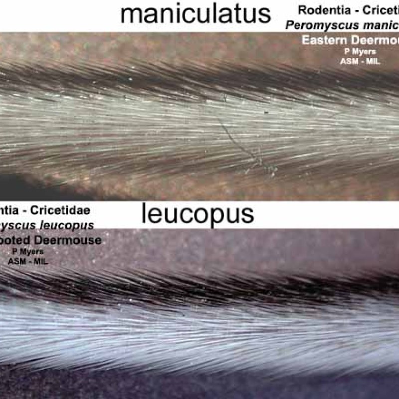 Same as 5588. Lateral views of tails of Peromyscus leucopus and Peromyscus maniculatus gracilis. Identified with use of salivary amylase.