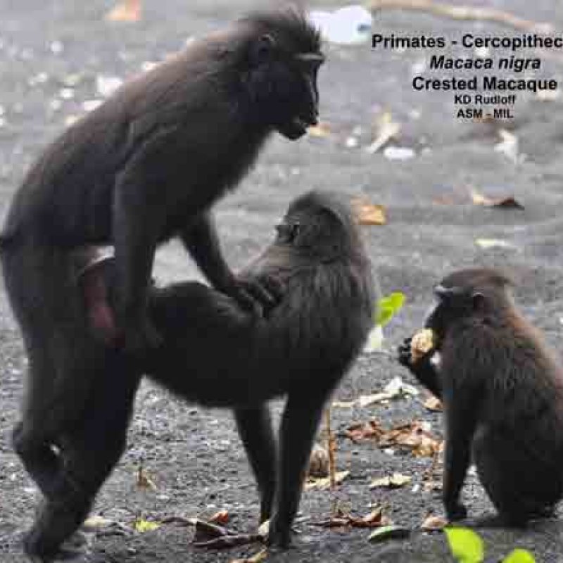 Pair in copulation. Also as Black Crested Macaque|Celebes Black Ape|Celebes Black Macaque|Celebes Crested Macaque|Celebes Macaque|Sulawesi Black Macaque|Sulawesi Crested Black Macaque.